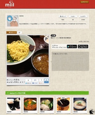 ミイル(miil)が、ユーザーがiPhoneアプリ「ミイル」から投稿した食べ物写真をまとめて見る事が出来るWebユーザーページをベータ公開しています。