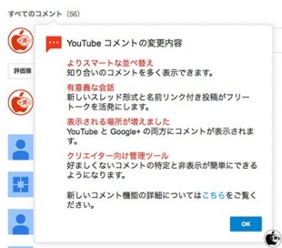 2013年11月07日(木) etc / インターネット#Google#YouTube#Google+ Google、YouTubeにGoogle+ の機能を活かした新しいコメント機能の提供を開始 ※本サイトは、アフィリエイト広告および広告による収益を得て運営しています。購入により売上の一部が本サイトに還元されることがあります。 Googleが、YouTube動画を閲覧する場合、Google+ の機能を活かした新しいコメント機能の提供を開始したと発表しています。 投稿したクリエイターからのコメント、人気の人からのコメント、盛り上がっている会話、そして Google+ であなたのサークルにいる人のコメントが上位に表示されるようになり、コメントを一般公開することも、友達など特定のサークルにだけ共有することもできるそうです。 動画を投稿するクリエイターであれば、特定のキーワードのブロックや、不快な発言の削除、特定の人の事前承認など、会話をより充実させるためのコメント管理機能が利用できるそうです。