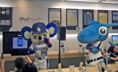 中日新聞が、Apple Store, Nagoya Sakaeで開催した「中日スポーツ「電子号外版」発表イベント」に、中日ドラゴンズのマスコットのドアラ、シャオロンがゲストとして来てました。