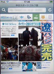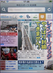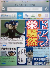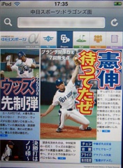 イベントで公開された1日だけの特別版「中日スポーツ電子号外版」(iPod touch/iPhoneからしかアクセス出来ません)は、朝日新聞が公開しているWebアプリケーション「i.asahi.com」とは違い、iPod touchのSafariに最適化されたデザインがされてます。