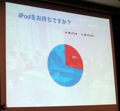 AUGM 長崎 2009で、アップルの西日本営業部 九州・沖縄エリア担当者が、同社が行なったiPodを所有しているかについてのアンケート結果を紹介し、持っていると答えた人が28%という結果だったと説明していました。