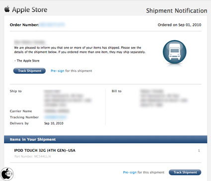 US Apple Online Storeが、iPod touch (4th generation)の注文者に対して、出荷を開始したとの案内を送っています。