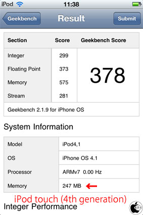 Appleが発表した「iPod touch (4th generation)」は、Primate Labsのベンチマークアプリ「Geekbench 2」を使った計測結果から、A4プロセッサ速度は、iPhone 4、iPadと同じ1GHzですが、搭載されているメモリー容量は、iPod touch (3rd generation)と同じ「256MB」だったことが確認できました。