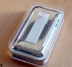 従来は、iPod touch本体を底面のプラスチック版から出ているガイドで挟み込む方式が採用されていましたが、今回から、iPod nano (6th generation)、iPod Shuffle (4th generation)と同様に、背面プラスチック版に切り込み口を設けて、そこに、本体を保護しているテープを回して固定する方式に変更されています。