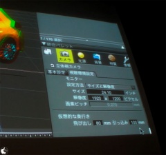 3Dシーンにカメラを設置し、左目/右目のどちらでマウスカーソルを追っているのかを決めてレンダリングする機能(3D立体視作業では必須)や、画面サイズと解像度を設定することで、表示する環境に合わせた作業を行うことが出来るようになっているそうです。