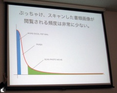 自炊といった言葉が注目されるようになってイメージスキャナに注目が集まっているが、電子書籍よりも紙で読む方が早い状況は変わらないと思うが、「スクラップ」するのと同じように、全てをデータ化して持ち歩けるようになることが重要で、例えば、写真アルバムに貼り込んだ写真を見直そうとする場合、物理的に写真アルバムがある場所にいかなければ出来ないが、祖母の写真など、全ての家族の写真をスキャンして、iPadに入れて持ち歩く事で、見る機会が確実に多くなると力説していました。