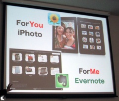EvernoteとiPhotoとの使い分け方法として、自分だけが見るものはEvernoteにアップロードして、人に見せる機会があると判断されるデーターの場合は、iPhotoに入れて、iPadに同期することで持ち歩くといった使い方が良いと思うと話してました。