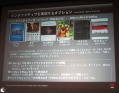 Adobe Digital Publishing Suite betaの特徴は、OmnitureのAdobe Online Marketing SuiteContent Viewerを通じて、電子出版が、購入者からどのように読まれているのかを収集分析する機能が備わっている事で、これは、広告受注などで、大きなポイントとなると説明していました。
