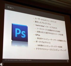 また、Photoshop が今後向かって行くであろう方向性については、ユーザからのフォードバックに対して真摯に耳を傾けつつ、ユーザの操作に対してリアルタイムに反映する "Just-in-time" イメージプロセス、それを実現する為のアルゴリズムの改良、GPU を更に活用する事によるパワーの向上、10年前のPC性能に近付いてきたモバイル機器への対応、そしてクラウドサービスの活用などを考えていると説明され、今後とも新たなる表現を実現する Photoshop を楽しんで欲しいという言葉でセミナーが締めくくられました。