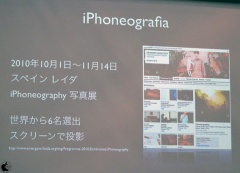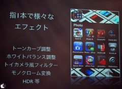 iPhoneだけで撮影し、iPhoneの中だけで加工し、それをインターネットサービスを通じて共有したりするといった、全てをiPhoneの中だけで完結することを「iPhonegraphy」と呼ぶと説明してました。