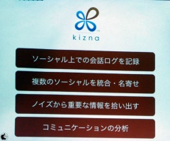 kizna はレストラン「豚組」中村仁社長の「丁寧に顧客対応をしていたら、自然とファンが生まれ、売り上げ増につながる」上に、ファンとなってくれたお客様が次のお客様を呼んで下さったり、ファンとなって下さったお客様は店がリーチ出来なかった Twitter などで寄せられた質問に対して自分の経験などを積極的に回答してくれて良い関係性が出来るという経験に基づき、これらの絆を更に深める為に「過去の貴重な情報を喪失させないための「ログ」機能」「分断されがちなソーシャルメディアを縦断しての情報管理」などを可能にするために開発されたサービスとなります。