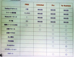 最初は Twitter アカウントを 2つ、ツイート保存数15,000、利用可能タグ数20に制限された無料の「Free」バージョンからサービス開始。1ヶ月ぐらいの間隔を空けて、これらの数量的制限を除かれる月額300円を予定している有料バージョンの「Unlimited」、投稿の時間予約 や ツイートの分析機能を追加した月額1,000円を予定している有料バージョンの「Pro」がサービス開始される予定となっています。2011年秋までには複数のメンバーで 1つのアカウントのメンテナンスなどを出来る「for Business」バージョンも立ち上げる予定となっており、これは「月額10,000円ぐらいになる見通し」という事でした。