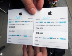 並んでいる方に、iPad 2 with Wi-Fi + 3G、iPad 2 with Wi-Fi、iPhone 4 ホワイトのどれを購入するかを記入する整理券が配られました。