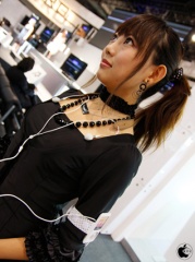 CEATEC JAPAN 2008において、パイオニアが、ブース正面のメインステージに立っているコンパニオン全員「iPod nano アームバンド」に入ったiPod nano (4th generation)
