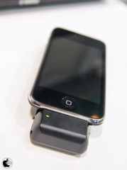 トランスミッターの駆動動力は Dockコネクターから供給される電力であるので、音楽を再生中の iPod の移動は自由自在。