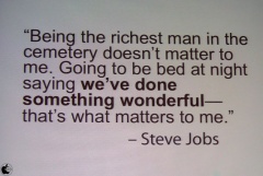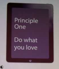 Steve Jobs CEOは、Appleに復活してから、Appleは情熱を持っていなければ世界を変える事が出来ないが、情熱を持っていれば世界を変える事が出来る。AppleのCoreになる部分の核心はそこにある」と語ったビデオを紹介し、これは、情熱を持った人々が、社会を良い方向に変える力を持っているということに他ならないと述べ「自分が何に情熱を傾けられるのか?」を考えてみると良いと思うと話してました。