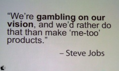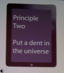 第2は、Steve Jobs CEOは、人々がコンピュータを使える事に情熱を傾けていたのではなく、人々のクリエイティブを解放するようなツールを作る事に情熱を傾けていたと話してました。Steve Jobs CEOの言葉として「宇宙に衝撃を与えろ」「自分たちのビジョンにかける」と言ったと紹介し、1人ではイノベーションを起こす事は出来ず、それに惹かれて集まったエバンジェリストによって実現することが出来る。自分が持っているビジョンによって、どれだけの人々を魅了することができるかが重要で、それによって実現出来るかどうかが決まると話してました。