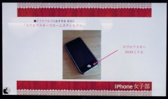 中級編は、各種iPhone 4用ケースの紹介がおこなわれました。あと、ホームボタンのデコパーツとして、スワロフスキークリスタルの「SS48ミリ玉」がサイズ的にピッタリだそうで、両面テープなどでつけると、以外に操作しやすくなると紹介していました。