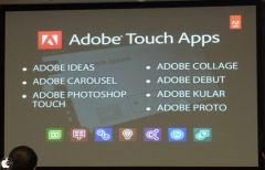 Adobe Touch Apps は現在 iOS 向けに提供されている、スケッチを描く「Adobe Ideas」、画像の共有を行う「Adobe Carousel」だけでなく、Android Market にて提供が開始された画像の編集を行う「Adobe Photoshop Touch」・イメージボードを描ける「Adobe Collage」・クリエイティブ作品のプレゼンテーションとプレビューを行える「Adobe Debut」・カラーテーマの作成・試作が出来る「Adobe Kuler」・ウェブサイト・モバイルアプリケーションのプロトタイプを作成できる「Adobe Proto」の 7アプリケーションにて提供されます。