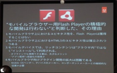 モバイルデバイスの現状について、Adobe としては iOS が Flash ネイティブに対応する事は考えられない事から Flash がモバイル環境へユニバーサルなサービスを提供するプラットホームとしては成立出来ないと判断しました。一方、収益化という観点からはメインストリームはブラウザ内で動作する Webアプリでなく ローカルアプリ となると判断しています。