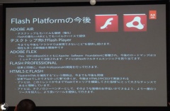 以上のような現状を踏まえ、アドビとしては Flash の技術は Adobe AIR として単体アプリケーションで提供する手法と、HTML5 へ変換・書き出す方法の 両方を提供します。アドビとしてはHTML5 と Adobe Flash を比較した場合、現状ではまだ Adobe Flash の方が表現力が高いと考えていますが、モバイル向け Flash への投資を終了するので成長著しい HTML5 には数年以内に表現力で逆転されることを予想しています。