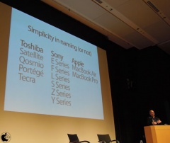 「Think Minimal」については、Apple Magic Mouseを例にして、何もボタンはないが、多くの機能が備わっている。ラップトップ製品についても他社と比べてモデル数が極めて少ないのがわかる。Steve Jobs氏は、1998年に20種類以上あった製品を4つに絞り込みすると説明した。ようは製品ラインのシンプルにしたかったという意思表示だったと説明しました。