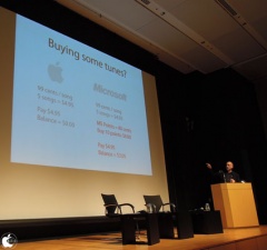 音楽を購入することについてMicrosoftと比較してみると、Appleは1曲99セントで販売し、Microsoftも同額で販売したが、これにMicrosoftはポイントも販売した。曲では無くてポイントを売ろうとしたので成功しなかった。何を売りたいのか?という根本的な方向性を見失ってしまった事例だと説明しました。