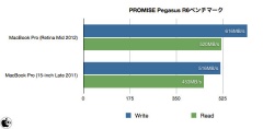 ダイワボウ情報システムが、2012年6月27日に開催した「DIS EXPO in 名古屋 2012」において、PROMISE Technologyが、Thunderbolt接続RAIDドライブ「PROMISE Pegasus R6」の実機展示を行っていました。そこで、MacBook Pro (15-inch Late 2011)とMacBook Pro (Retina Mid 2012)のThunderboltポートに接続し、Blackmagic Disk Speed Testでベンチマークを計測してみました。