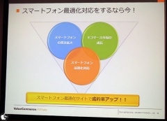スマートフォン最適化として、モバイルショッピングの不満の上位は、「商品が探し辛い」(62.6%)、「画像が不十分」(51.4%)「ページ移動が遅い」(31.3%)を上げるユーザーが多く、単にレイアウト対応するだけでなく、見やすさ、操作性の良さも考慮する必要があると説明していました。