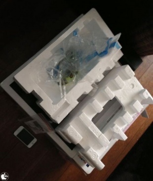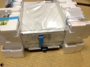 中を開けるとビニール袋と15カ所ほどを止めた青いガムテープ、そして固定用の発泡スチロールに収められた本体が姿を現します。