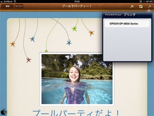 この状態で、既に同じ無線LANに接続してあるiPadでMailやPagesを起動し、共有メニューから「プリント」を選ぶと、同製品の名前が表示されます。ここでプリンターを選んで「印刷」ボタンをタップすれば、印刷ができます。