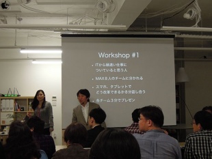 講演の後半部分では、参加者をいくつかのグループに分けて、グループの中で、ITから縁遠い仕事についている思う人を選び、その仕事をスマートフォンやタブレットでどう改革出来るかを話し、それをプレゼンテーションするというワークショップが行われました。