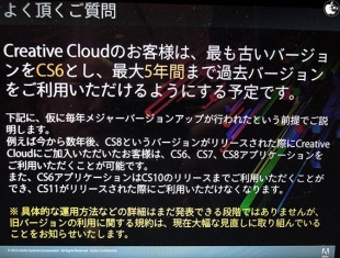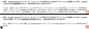 これに関連しているのかは不明ですが、Adobe Creative Cloud / FAQにある「現在、Creative Cloudメンバーとして、メンバーシップに含まれているCS6アプリケーションを使用しています。Creative Cloudで次期バージョンのCS製品版が利用可能になると、CS6は利用できなくなりますか?」の内容が修正され、以前は「その後1年間はダウンロードとインストールが可能」と記載されていたのが、「従来のライセンス方式で購入したCreative SuiteアプリケーションとCreative Cloudアプリケーションを同時に実行出来る」といった感じに修正されています。