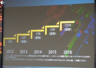 page2013の無料セミナーゾーンで行われた「Adobe Creative Cloudトークセッション」において、アドビ システムズのマーケティング本部フィールドプロダクトマネージャー岩本崇氏は、現在、Adobe Creative Cloudは、Creative CloudでCS7が提供開始された場合、CS6バージョンのアプリケーションをダウンロードしてインストールしてあるのであれば、メンバーシップが有効である限り、そのバージョンを支障なく使い続けることができ、CS7バージョンの提供が開始された場合、その後1年間はダウンロードとインストールが可能だと説明しているが、これを最も古いバージョンをCS6とし、最大5年間まで過去バージョンを利用できるようにする予定であると説明していました。