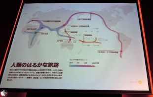 また、メディア再生だではなく、例として、人類が大陸移動する地図を表現する場合、紙面では1つのイラスト図版になってしまうが、電子書籍では、人類が大陸移動する時間の軌跡をインタラクティブに表現することが可能だと話していました。
