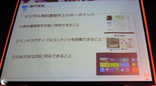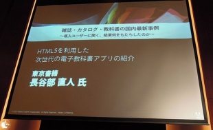 東京書籍の長谷部直人氏は、iPadで学ぶ 高等学校デジタル教科書をADPSを使って制作していて、元々、教科書をInDesignを利用して編集していたため、そのデータをベースに作り込む事が可能だったこともADPSを選んだ理由の1つだと話してました。