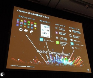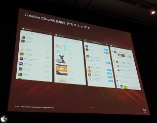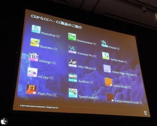 今後Adobe製品は「Adobe Photoshop CC」といった感じに「CC」とブランド変更し、Adobe Application サービスなどから提供する方式に変更すると説明した。