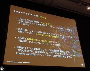 Adobe Creative SuiteはAdobe Creative Suite 6を持って終了し、パッケージ販売は在庫限りとなり、個人版はダウンロード販売のみの提供で、法人向けはTLP/CLPライセンスでの提供のみになると説明した。