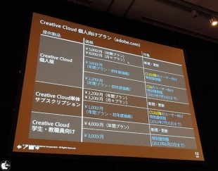 価格については写真の通りで、Adobe Creative Suite 6ユーザーの一部は2,200円/月(年間プランの初年度価格)などが用意されている。