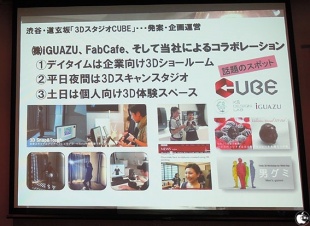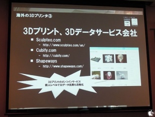 3Dプリンターばかりが取り上げられるが、そもそものデータを制作することは紹介されないが、3Dプリンターデータをどうやって制作し、どうやってデータを販売するかといったムーブメントも海外では広がっていると紹介した。