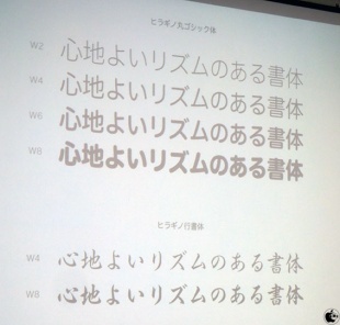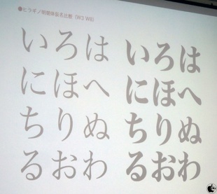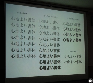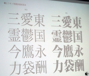 Macworld Conference & Expo/Tokyo 2001の基調講演で、Mac OS Xにヒラギノ書体がバンドルされることが紹介され、スティーブ・ジョブズ氏は「愛(W6)」を表示して「クール」と言ったと話してました。