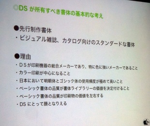 ヒラギノ以前の話しとして、大日本スクリーンの要求は、モリサワのライセンスを受けているが、チラシ組版機器(IP)に使う書体を自前で欲しいということで、全ての書体が同じ土俵に乗っても生き残れる、大日本スクリーンにとっての最終的な書体体系を示してほしいと言われたそうです。