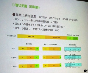 現状把握として、大日本スクリーンに書体が分かる人がいなかった。そのため、商業印刷物調査を行った。パンフレット一冊に使われる書体数7.5書体、本文、小見出し、大見出しの書体頻度を調査した結果、明朝体40%、ゴシック38%、丸ゴシック12%、筆書など12%が利用されていることが分かったそうです。