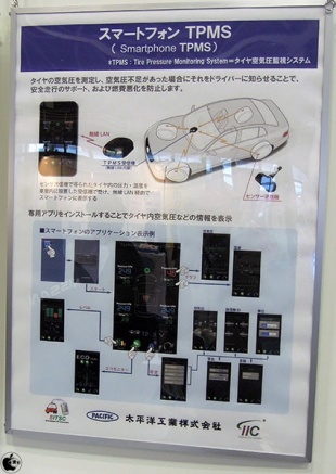 あいち ITSワールド 2013において、太平洋工業が、タイヤ空気圧監視システム「スマートフォンTPMS」を展示していました。