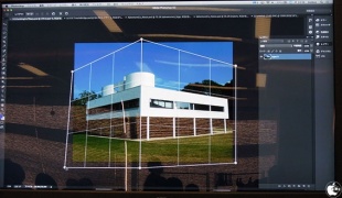 Adobe Photoshop CC(Ver.14.2)の新機能として、視点を変えずに遠近感を変更出来る「遠近法ワープ」が追加され、建物などの物体を自由に変形することが出来ると説明した。