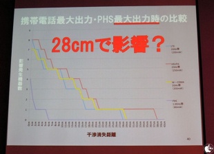 医療現場でスマートフォンは携帯電話を使用すると、医療機器に2センチ近づけると誤動作すると紹介した。誤動作は発生するが、機械に抱きつかない限り誤動作しないともいえると説明した。