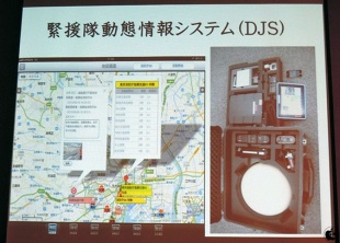 緊急消防援助隊情報システム「DJS」を紹介し、iPadを使用して、現場隊員が必要とする情報共有支援を行えるべく開発を行っていると説明した。