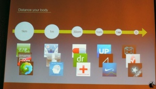 距離で例えてアメリカのスマート医療導入事例を紹介した。30cmの距離では医療アプリが多くリリースされており、1cmの距離ではアプセサリーデバイス関連製品が、1mmの距離では血糖値を測るデバイス関連製品がリリースていると紹介した。
