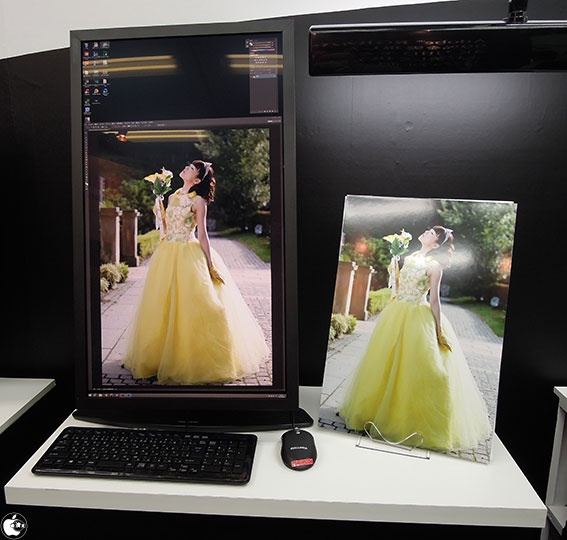 縦表示で、A3サイズで印刷されたプリントを、TUM-32PRO1で等倍表示で並べ、さらにその上にPhotoshop CCのカラーパレットを表示可能というデモを行っていました。