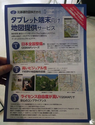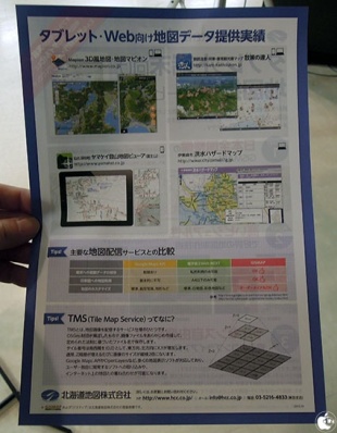 具体的な展示は無くチラシのみでしたが、提供実績として「3D風地図・地図マピオン」「伊勢崎市洪水ハザードマップ」などのWebサービスに加え、iPhone/iPadアプリ「散策の達人」、iPhoneアプリ「ヤマケイ登山地図ビューア (山と溪谷社)」が紹介されていました。